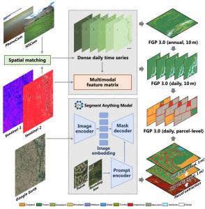 The framework integrates three modules: annual mapping, dynamic daily monitoring, and high-resolution parcel classification. Annual mapping combines Sentinel-1 SAR, Sentinel-2 spectral data, and near-surface camera inputs using automated spatial matching algorithms to reconstruct daily NDVI time series. This enhances accuracy across diverse ecosystems, particularly in cropland–shrubland mosaics. For dynamic monitoring, the system uses migrated sample sets and reconstructed images to detect land transitions at a daily scale, capturing short-term events often invisible to satellite-only approaches. High-resolution mapping leverages SAM, implemented through the open-source samgeo tool, to segment parcels and reduce salt-and-pepper noise, producing cleaner and more cohesive classifications. Tests in China showed the framework accurately tracked crop rotations of winter wheat and maize at the parcel level. Compared to previous versions, FGP 3.0 reduces misclassification, improves boundary precision, and scales effectively from regional to global levels.